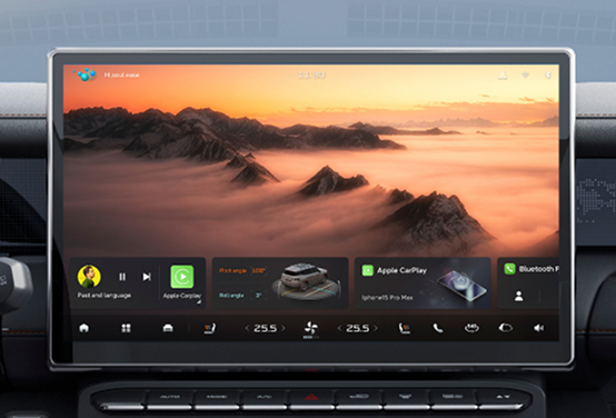 Pantalla táctil flotante de 15,6″ con conectividad Apple CarPlay y Android Auto, que permite controlar funciones del vehículo, acceder a servicios multimedia y personalizar configuraciones según las preferencias del usuario.