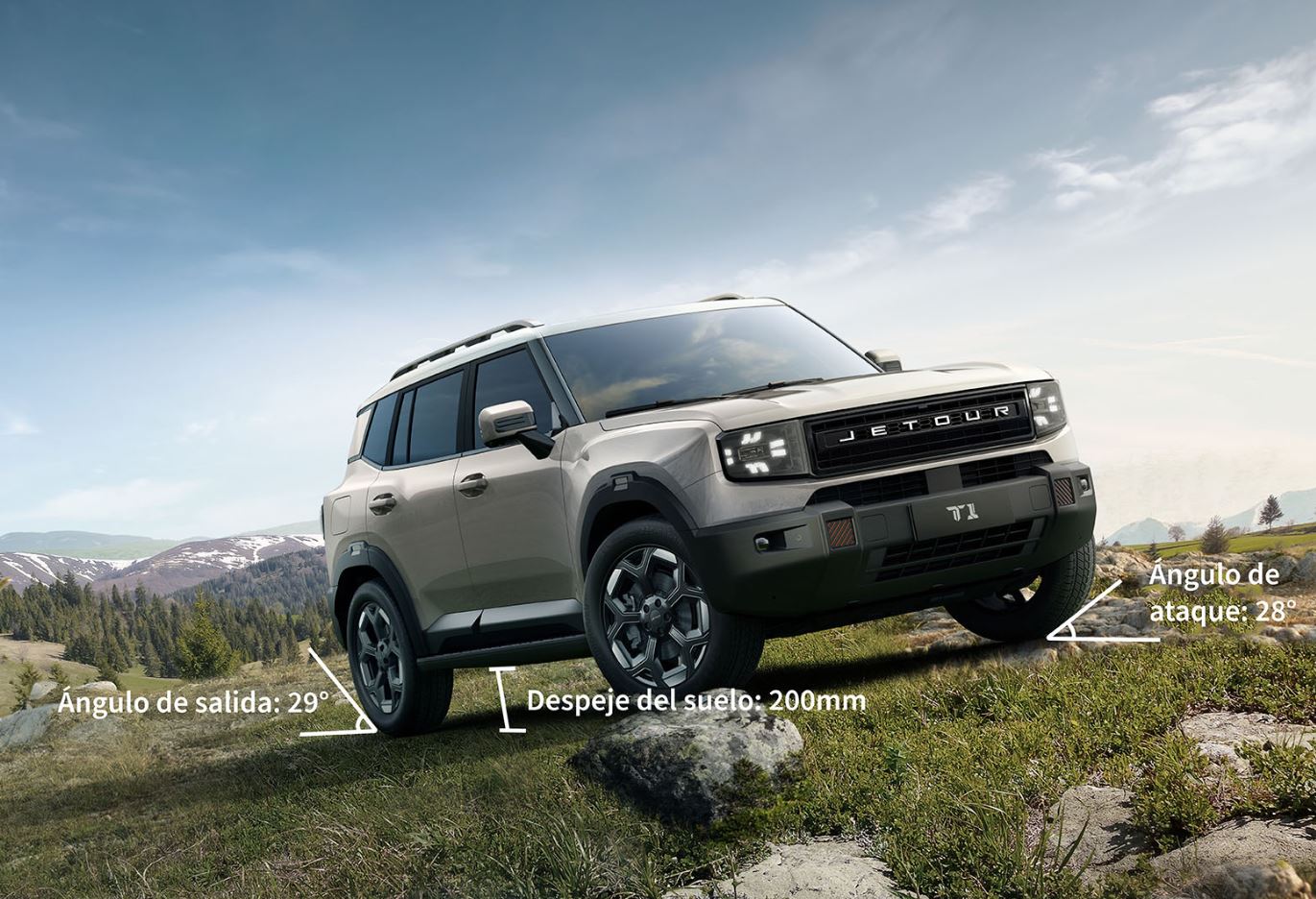 El Jetour T1 incorpora techo solar panorámico, faros Full LED en forma de trébol y llantas de aleación con diseño geométrico, que refuerzan su identidad robusta y moderna.